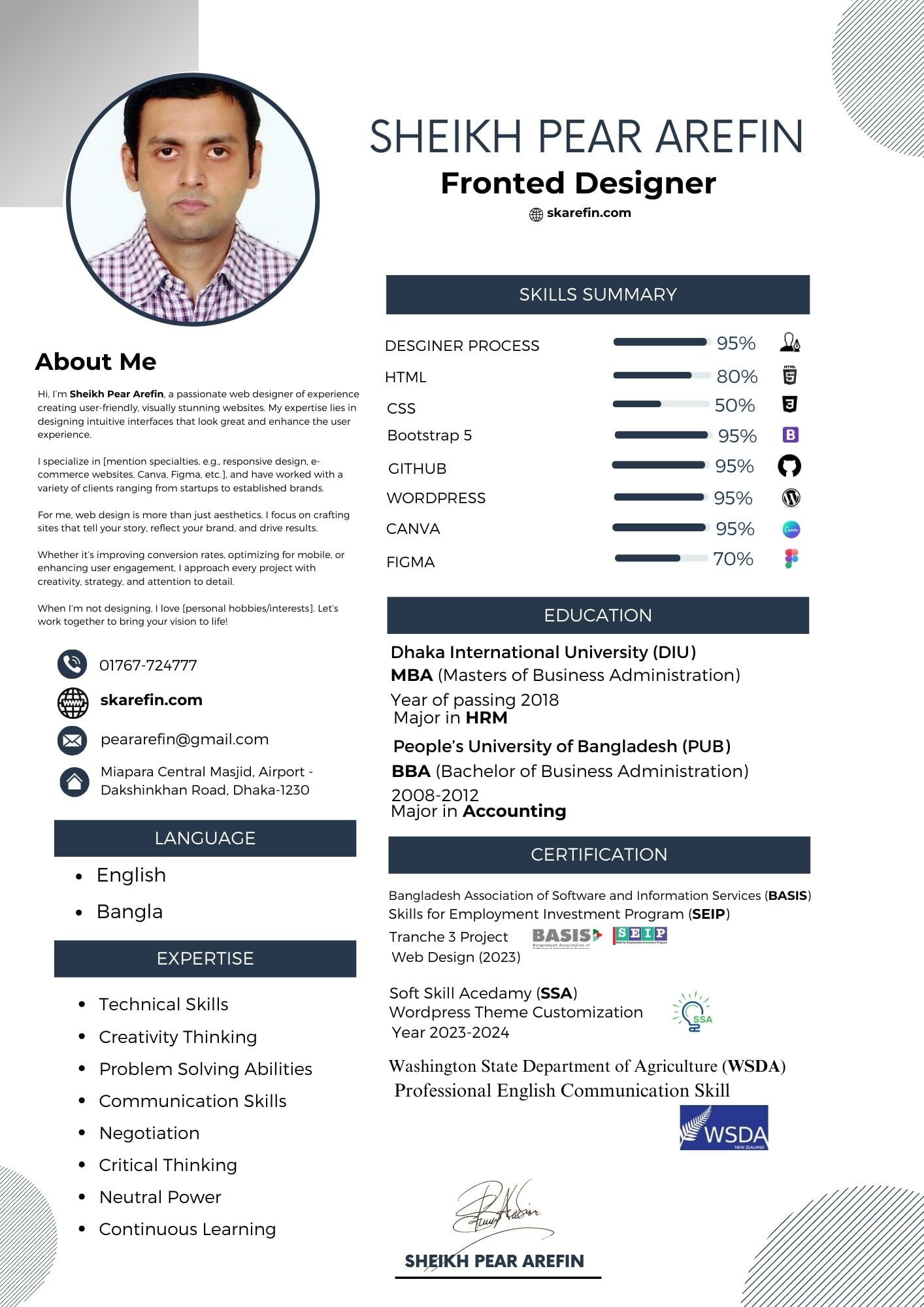 Hi, I’m Sheikh Pear Arefin, a passionate web designer of experience creating user-friendly, visually stunning websites. My expertise lies in designing intuitive interfaces that look great and enhance the user experience. I specialize in [mention specialties, e.g., responsive design, e-commerce websites, Canva, Figma, etc.], and have worked with a variety of clients ranging from startups to established brands. For me, web design is more than just aesthetics. I focus on crafting sites that tell your story, reflect your brand, and drive results. Whether it’s improving conversion rates, optimizing for mobile, or enhancing user engagement, I approach every project with creativity, strategy, and attention to detail. When I’m not...........